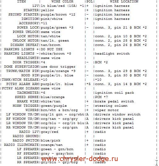 Установка автосигнализации на Dodge Neon. Точки подключения, расположение и цвета проводов